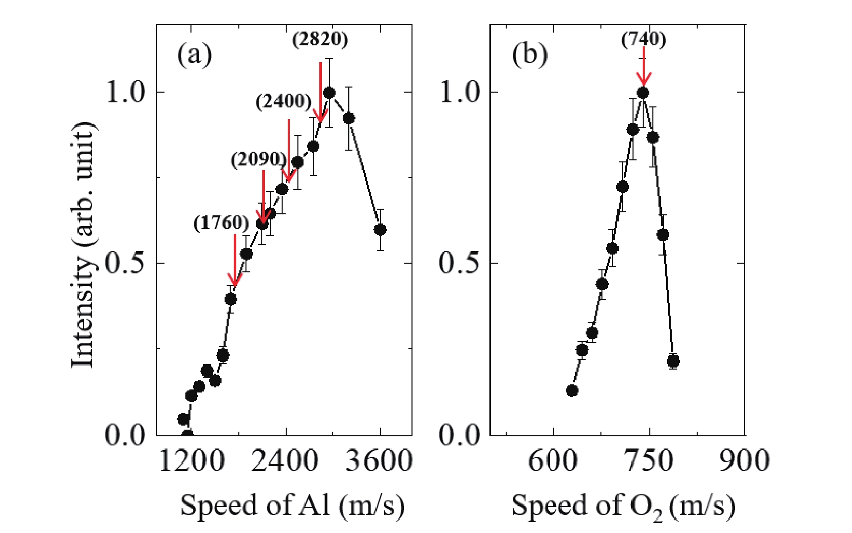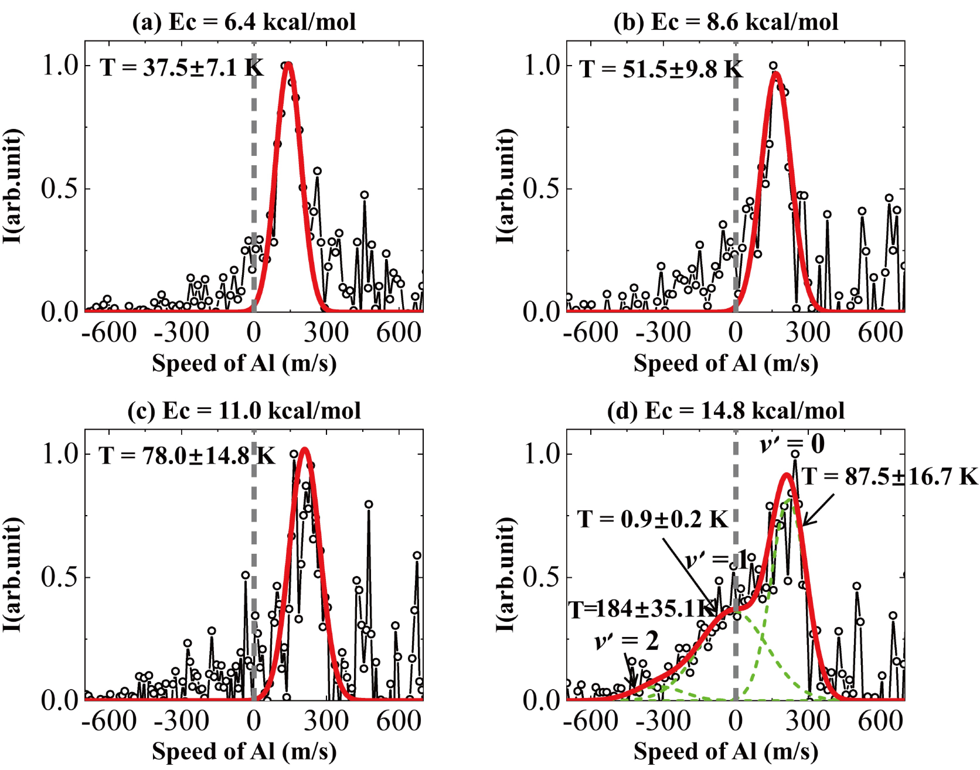 As the Al velocity in the laboratory frame $\left|\vec{v}'_{\rm{Al}}\right|$ approaches to zero, a corresponding decrease in the kinetic energy of the Al atoms is anticipated. This phenomenon is depicted in FIG. 4, where a pronounced signal corresponding to the vibrational excitation of O2 ($ v' $ = 1) is observed for the slow Al atoms. The observed signal enhancement can be attributed to the high probability of the laser detection during the density-to-flux transformation [41].