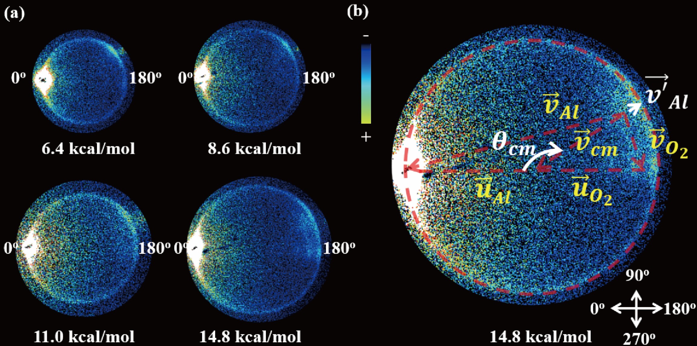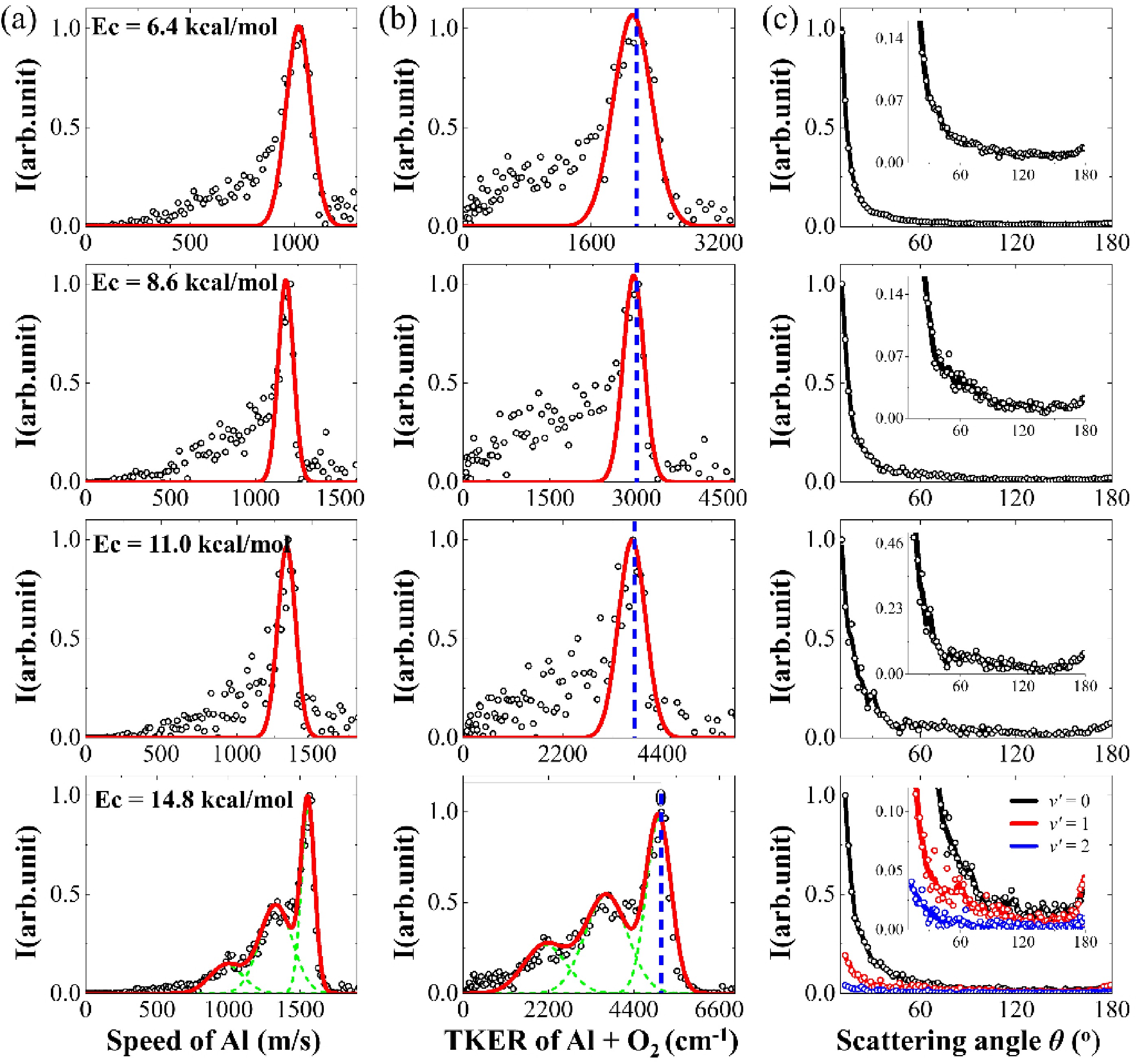 The speed distributions of the Al products were derived by integrating the signals from the images in the backward direction (180°±20°), allowing for a better resolution, and were transformed into the total kinetic energy release (TKER) distributions of Al and O2 reactants, in accordance with the principle of conservation of recoil momentum, as illustrated in FIG. 3 (a) and (b), respectively. At low collision energies, the velocity distribution of scattered Al atoms shows a strong background effect from the Al beam. This occurs because the density of slow-moving Al atoms is lower than that of fast-moving Al atoms during the beam expansion, as illustrated in FIG. 1(a). Consequently, the signal-to-noise ratio is poorer at low collision energies compared to high collision energies. In FIG. 3(b), the peaks of the TKER distributions for three low collision energies (Ec) of 6.4, 8.6, and 11.0 kcal/mol are observed at 2180, 3000, and 3790 cm−1, respectively, which align with the respective collision energies. At a higher collision energy of 14.8 kcal/mol, the kinetic energy distributions of Al and O2 present a series of peaks that are assigned to the vibrational excitation of O2 up to v' = 2 based on the conservation of energy. The spacing between adjacent peaks of ca. 1550 cm−1, as determined through Gaussian fits, aligns with the vibrational constant of O2 (ωe = 1580 cm−1) [42].