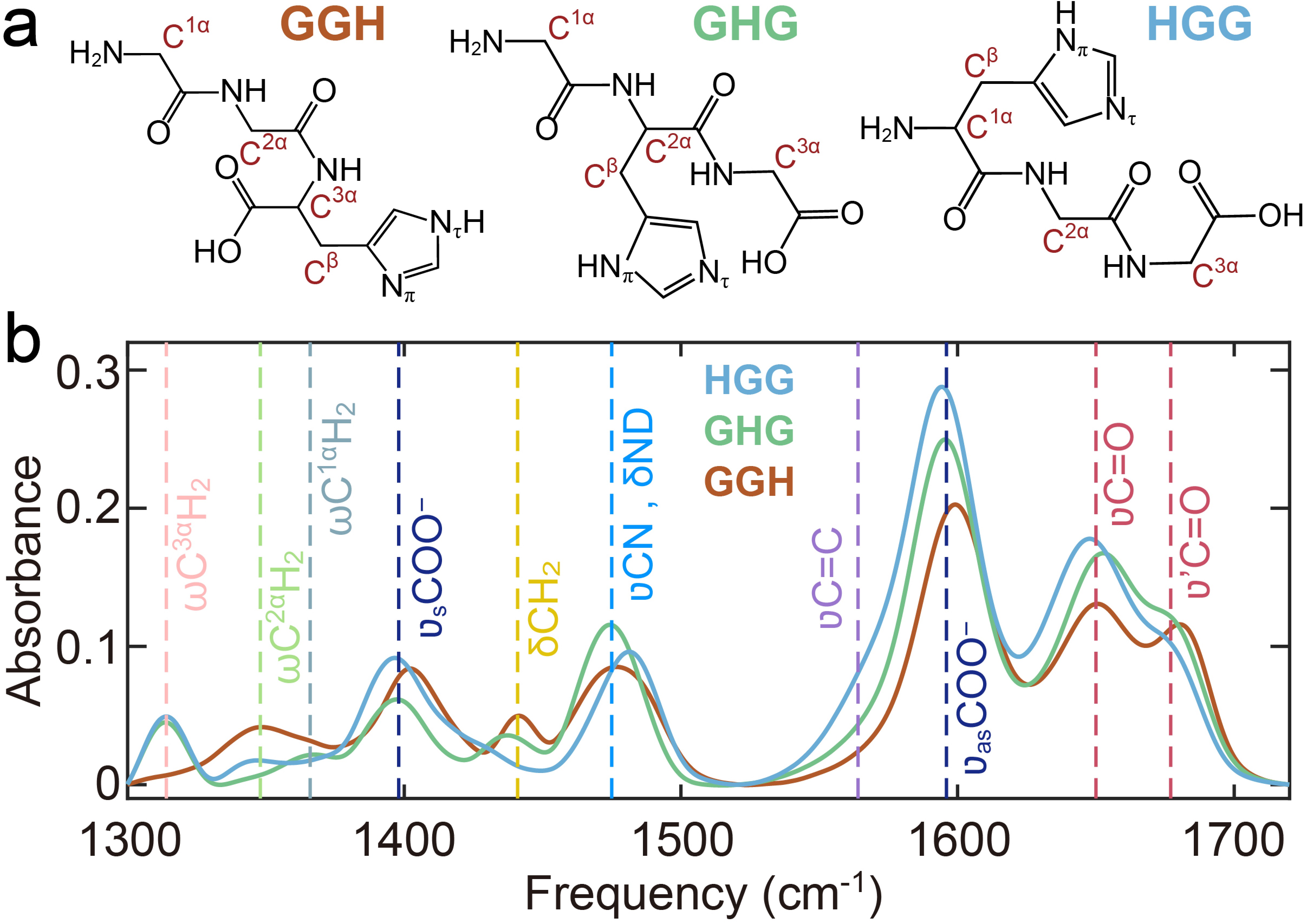 While the IR spectra of GGH, GHG and HGG showed considerable similarity in the region of 1530−1700 cm−1, their Cu(II) complexes exhibited significant differences (FIG. 2), revealing that substantial influence of His residue positioning on Cu(II) coordination geometry. Previous studies have established that Cu(II) coordination to imidazole nitrogen induces marked changes in the His