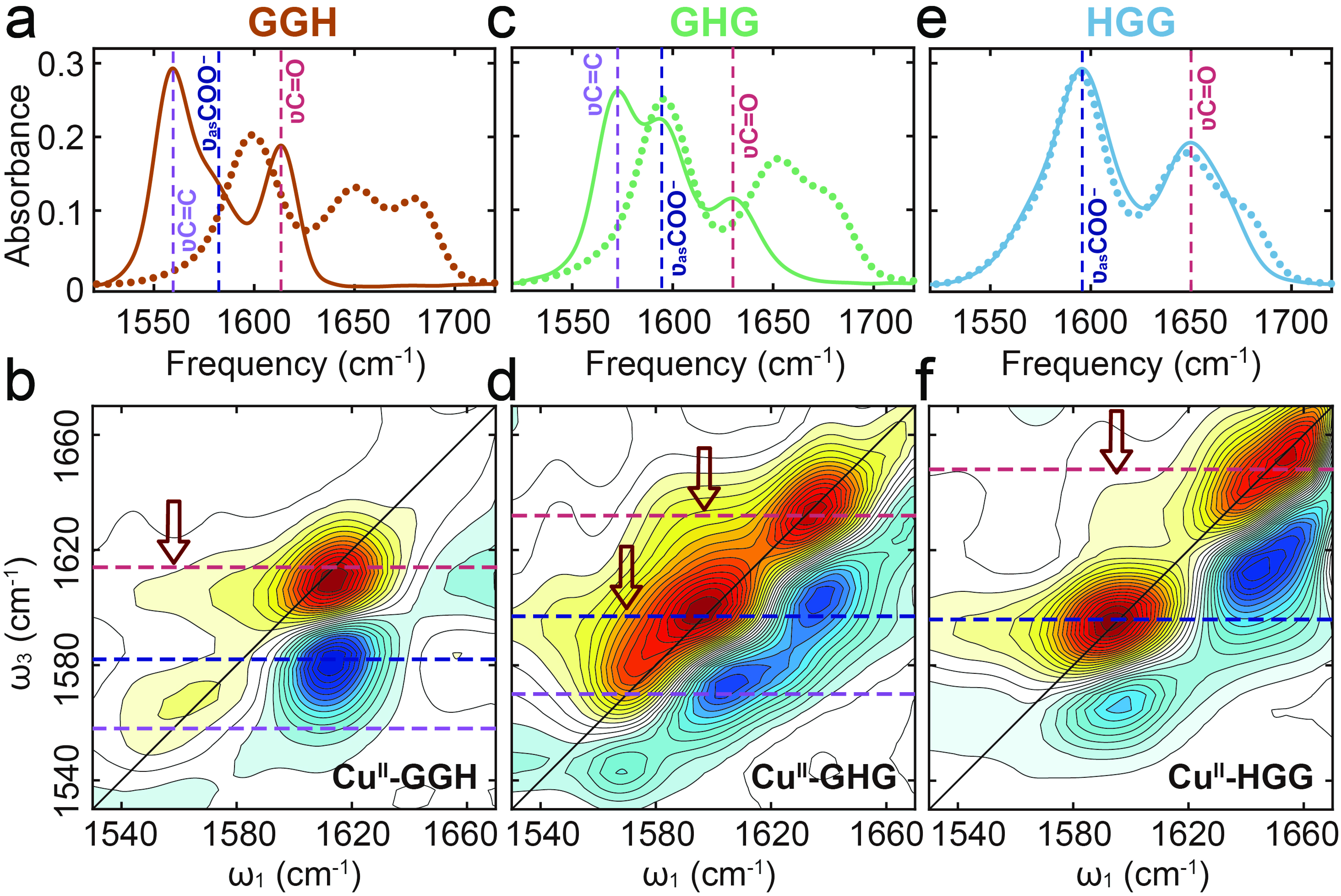 $ \nu $ C=O band to 1615 cm−1 (FIG. 2 (a) and (b)). Although the GGH C-terminus does not serve as a ligating site, the formation of Cu(II)-GGH still affects the$ \nu_{\rm{as}} $ COO− band, shifting its peak frequency from 1596 cm–1 to 1584 cm−1 [19]. Observation of cross-peaks at ω1/ω3 = 1558/1615 cm−1 but not at ω1/ω3 = 1558/1584 cm−1 (FIG. 2(b)), confirms that imidazole ring and deprotonated amide group share the same Cu(II) coordination sphere, which left the C-terminus out.In contrast to GGH, GHG showed smaller frequency shifts upon Cu(II) coordination (FIG. 2 (c) and (d)). The broadened