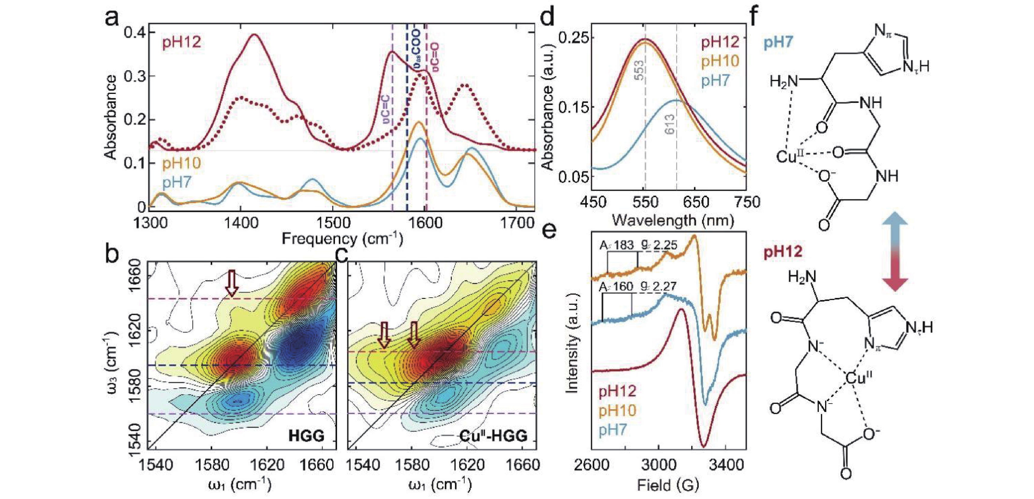 Copper (Cu) is an essential trace element in living systems, acting as a cofactor in diverse biological oxidation-reduction reactions and responsible for the formation of reactive oxygen species. Besides its vital role in massive oxidases and oxygenases [1], Cu plays crucial roles in diverse metabolic pathways and forms dynamic complexes with amyloid peptides. These Cu-peptide interactions have been implicated in the pathogenesis of several severe disorders, including Alzheimer disease, diabetes mellitus, and cancer, as well as in copper homeostasis diseases (Menkes disease and Wilson disease) [2−6]. In the proteins associated with these diseases, histidine (His) residues play essential roles in Cu coordination, highlighting their critical physiological functions and therapeutic potential [7−9].