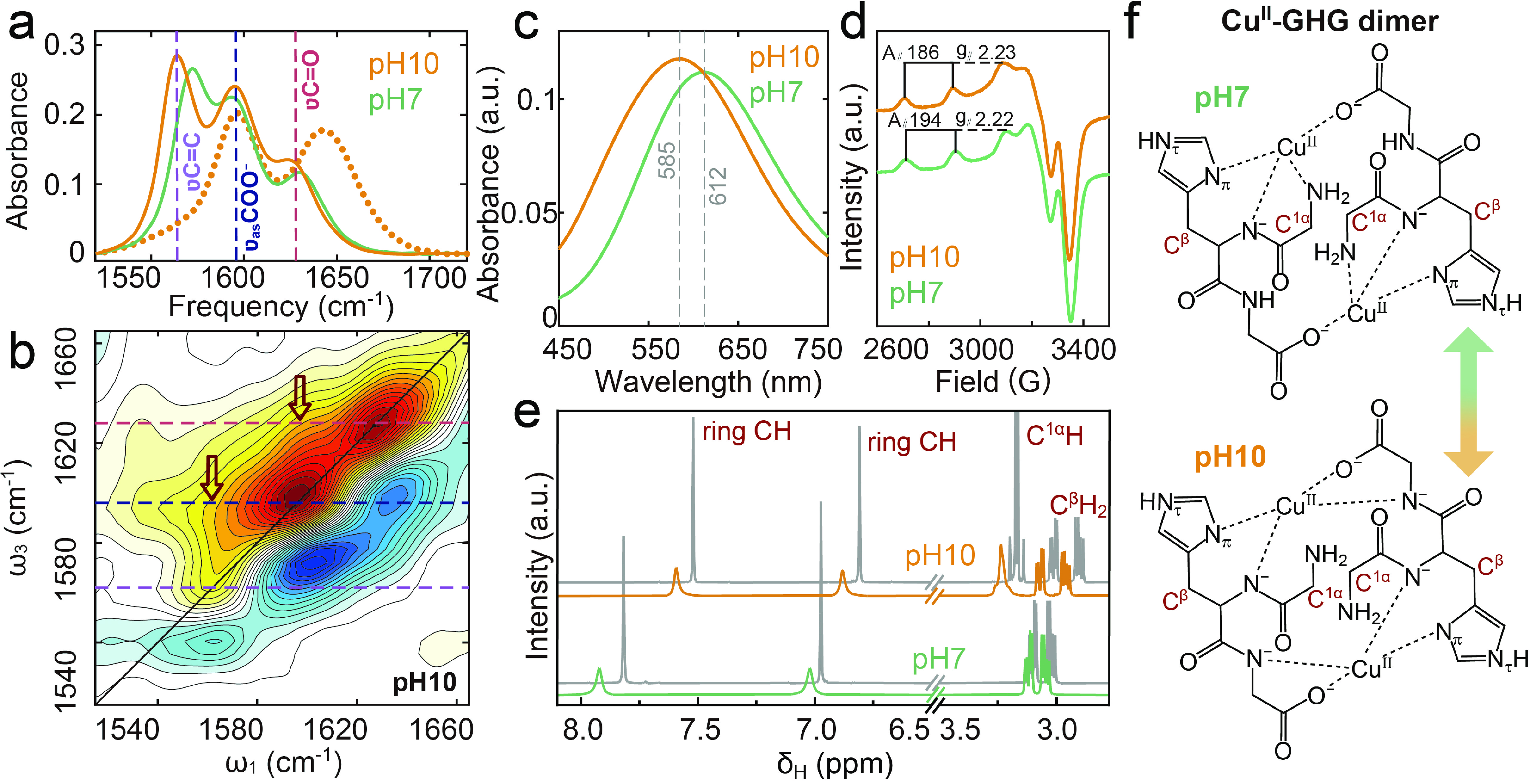 To elucidate the role of the histidyl residue in Cu(II) coordination, we examined pH-dependent structural changes in Cu(II)-HGG complexes using FTIR, 2D IR, UV-Vis, and EPR spectroscopies (FIG. 3). Increasing pH from 7 to 10 induced a red shift of the amide I band and an intensity drop of the amide II band (FIG. 3(a)), consistent with amide hydrogen substitution by Cu(II). At pH 12, the amide I band intensity dropped sharply, while three new bands emerged at 1560, 1582, and 1605 cm−1. The emergence of 1560 cm−1 band confirmed His residue coordination to Cu(II). The significant frequency shift of amide I band from 1643 cm−1 to 1605 cm−1 (FIG. 3(a)) and