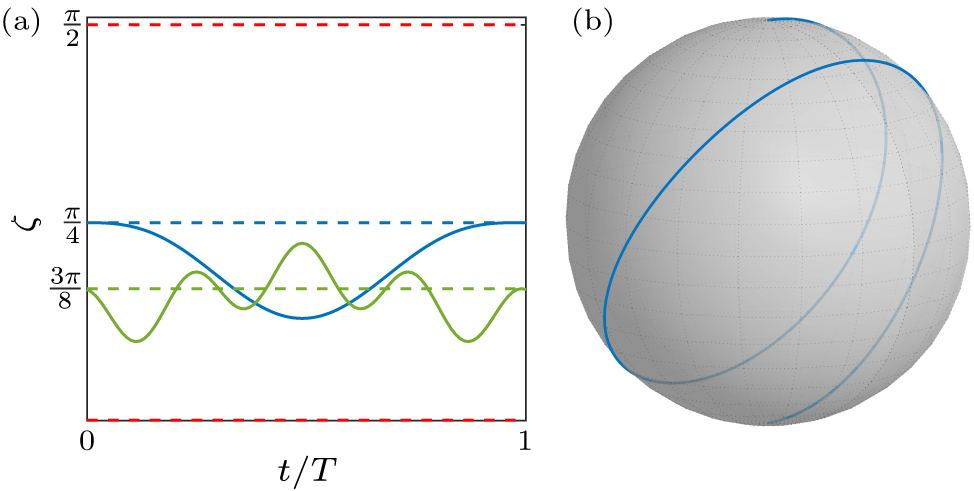 Note that ζ(t) is limited to avoid the divergence of the terms 1ζ˙2/Ω2 and cot(2ζ), leading to the restriction of its value within the range of (0, π/2), as shown in Fig. 1. Furthermore, this restriction will limit the evolution time to the order of 1/Ω. Note that ζ(t) serves as an auxiliary dimensionless function, whereas ζ˙(t) is connected to physical quantities which have the unit of frequency, such as Ω(t) and Δ(t) in Hamiltonian. As a result, we obtain a relationship that the evolution operator and time-dependent Hamiltonian are both dependent on ζ(t). Since the form of the ζ(t) function can be designed almost at will, it allows for the generation of arbitrary evolution operators. In other words, we can design arbitrary ζ(t) functions and then derive the corresponding Hamiltonian and its evolution operator as an analytical-assisted solution.
