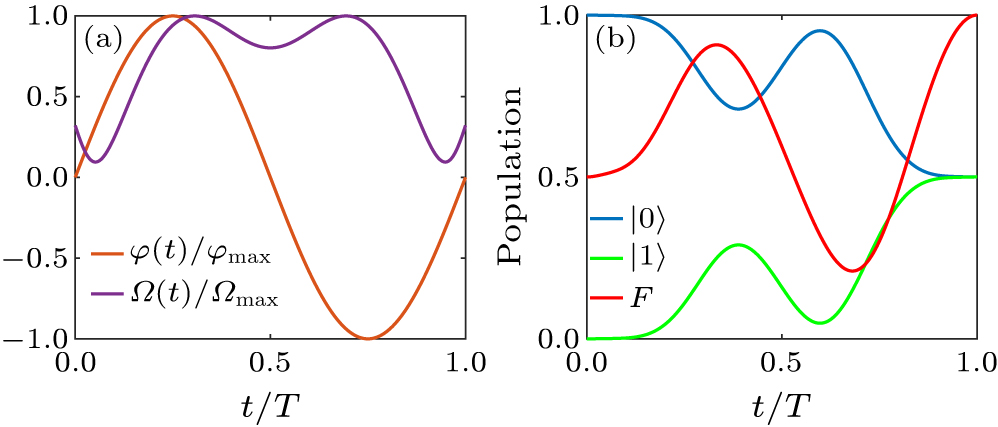 where An is a constant, and the trigonometric series are involved to satisfy ζ(0) = ζ(t). Two examples are shown in Fig. 1, with the boundary conditions of ζ(t) to respect population exchange gates and Hadamard like gates, with parameter sets of {A0,A1,A2,A3} = {π/4, 0, 0, −0.38} and {A0, A1, A2, a2, A3, a3} = {3π/8, 0, −0.22, 4, 0.18, 1}, respectively. And the ζ(t) function is plotted in Fig. 1(a). In Fig. 1(b), we show an evolution path of the NOT gate by further setting Δ = 2π MHz and T = 0.69 μs. Similar to σxy control, we design a Hadamard gate when assuming there exists a harmful constant detuning Δ′ = 2π MHz and the time-dependent phase φ(t) = sin(2πt/T), as shown in Fig. 2. The Hadamard gate can be obtain when the parameters of ζ(t) are {A0, A1, a1} = {π/8, 0.26, 1} and time T = 0.66 μs. The fidelity of the state |ψ(t)〉 is defined as F(t) = |〈Ψ|ψ(t)〉|2, where |Ψ〉 labels the ideal target state.
