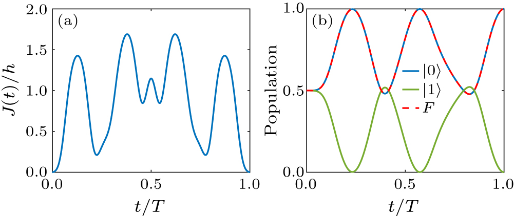 with parameters {A0, A1, A2, a2, A3, a3} = {3π/8, 0, −0.22, 4, 0.18, 1}. Under these settings, a H gate is implemented. The pulse shape of J(t)/h, the corresponding state population and the gate-fidelity dynamics of this case are shown in Fig. 3.