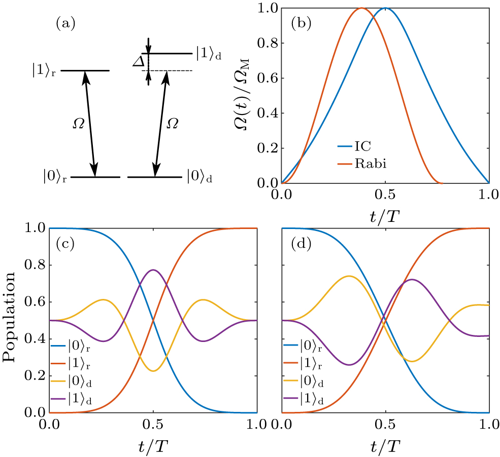 • In many quantum control systems, there are numerous nearby transitions with comparable frequencies. Consequently, when implementing a desired manipulation on a target transition, there will inevitably be leakage to nearby transitions with different detuning. This is also the case for some qubit systems, such as NV-center systems,[34] trapped ions,[35] and molecular systems.[36] We here show an example of individual control over two nearby transitions by using our analytical-assisted solution, and the corresponding energy level structure is presented in Fig. 4(a). This driving Hamiltonian on both transitions could be written as